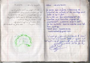 Zdjęcie przedstawia dwie otwarte strony podróżniczego notesu. Kartki są jasne, lekko zniszczone i zapisane ręcznie. Na górze lewej strony widnieje niebieski nadruk „Konsulat Generalny Rzeczypospolitej Polskiej w Barcelonie” oraz odręczne notatki w języku polskim, z datą z 2010 roku. Na górze prawej strony znajduje się ręcznie napisany tekst w języku hiszpańskim – osobista wiadomość z życzeniami powodzenia w dalszej podróży, podpisana imieniem i nazwiskiem autora oraz datą. W dolnej części lewej strony umieszczona jest duża, okrągła, kolorowa naklejka z logo „Camping Las Torres” z Murcji, przedstawiająca stylizowany zamek, góry i fale. W dolnej części prawej strony znajdują się cztery małe fotografie: kolorowe domki, krajobraz, portret uśmiechniętego mężczyzny oraz zdjęcie podróżników przy tablicy „Cape of Good Hope”. Całość ma charakter osobistego archiwum podróży, łączącego notatki, pieczątki i wizualne pamiątki z drogi.