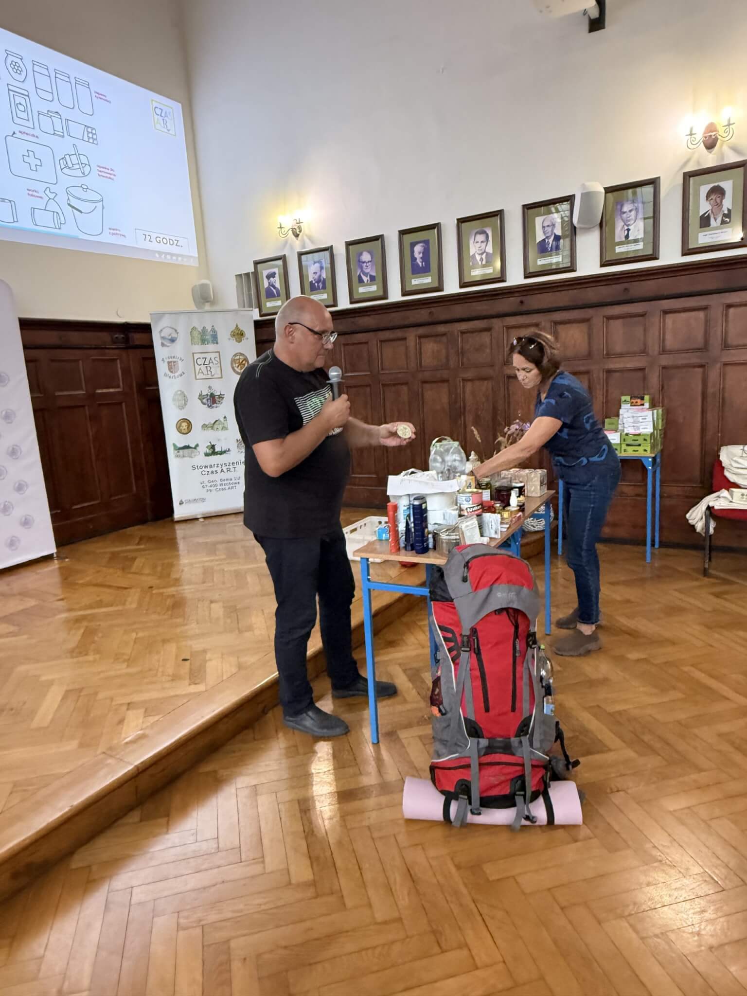 Uczestnicy warsztatu zobaczyli na żywo, co powinno znaleźć się w plecaku ewakuacyjnym, jak wygląda zapas na 72 godziny w sytuacji kryzysowej oraz mogli poczuć, ile taki ekwipunek naprawdę waży.